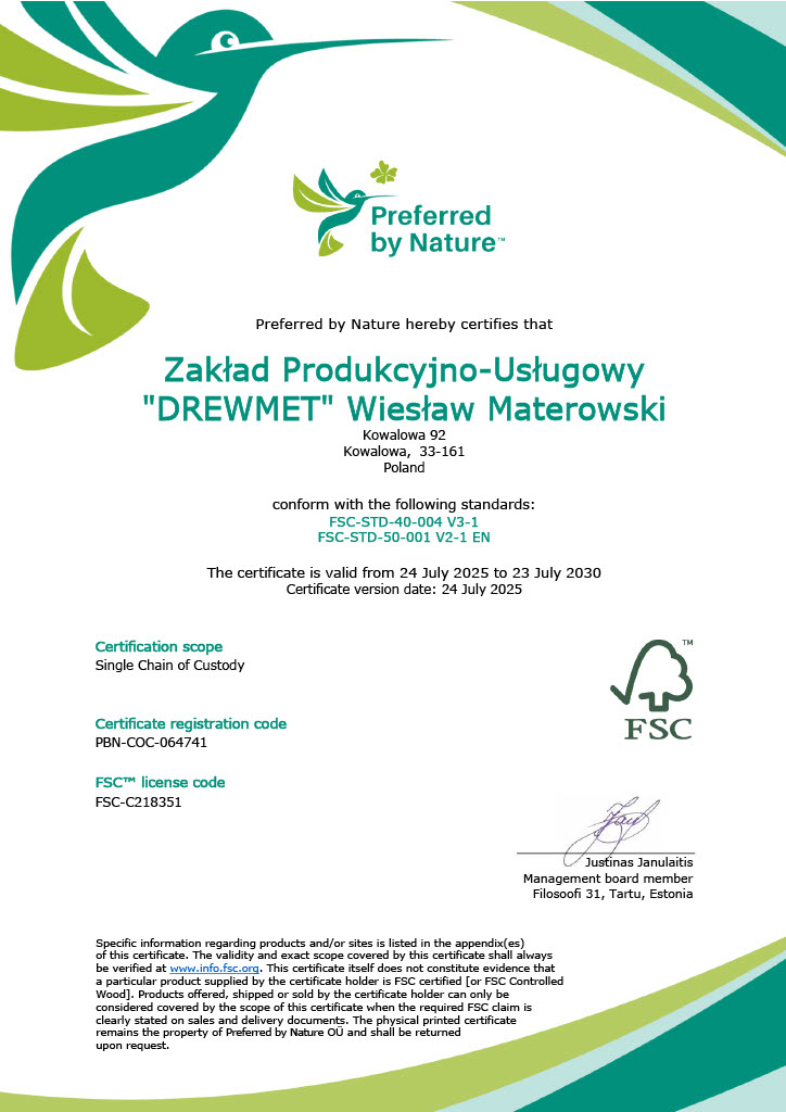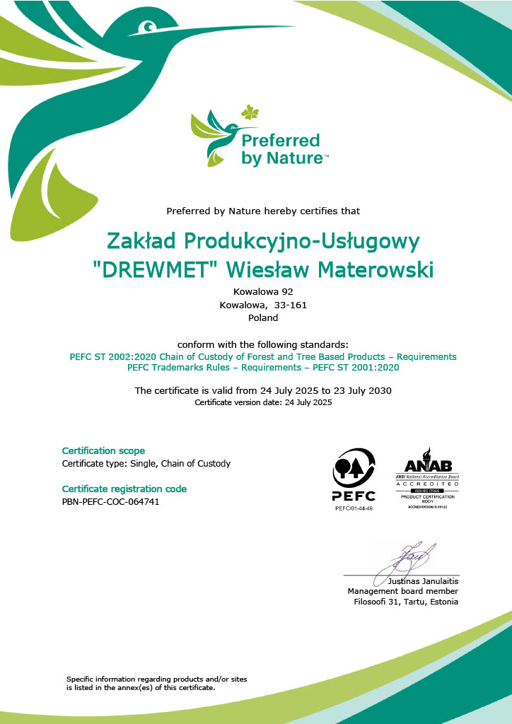 ⦁ Dbamy o środowisko, dlatego korzystamy z drewna pochodzącego z certyfikowanych polskich lasów (PEFC/FSC), zarządzanych w sposób zrównoważony i odpowiedzialny.